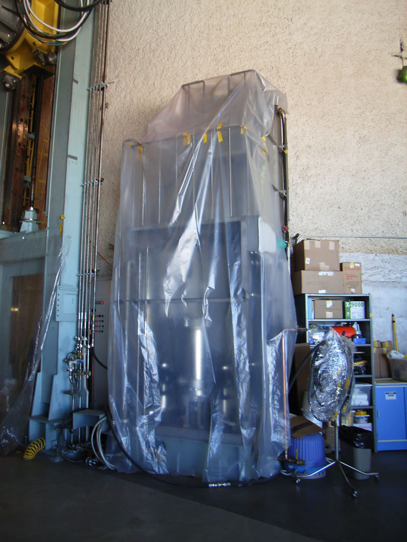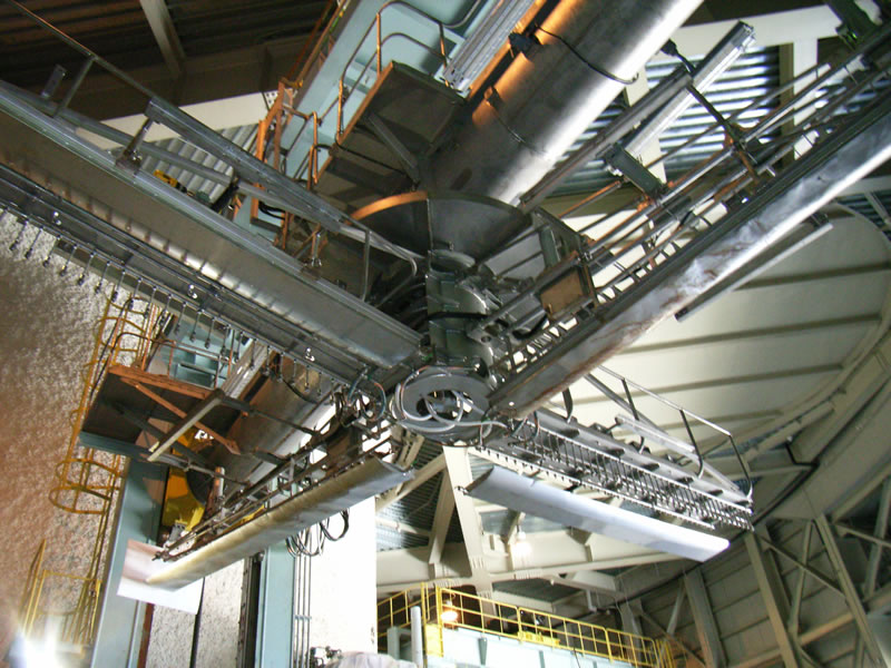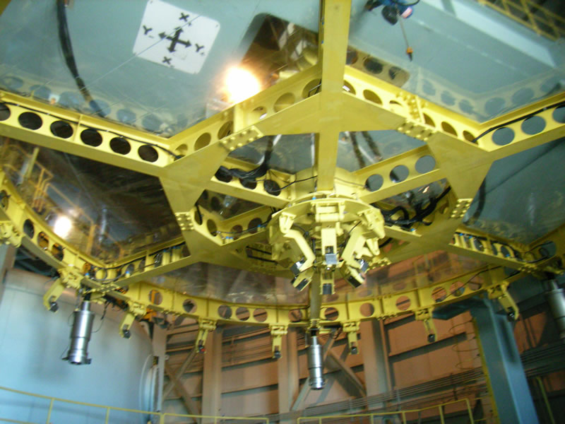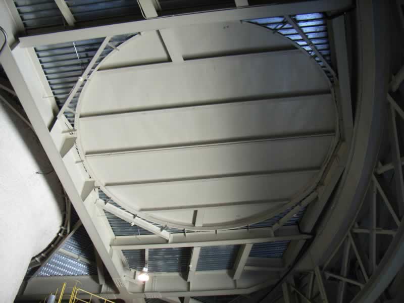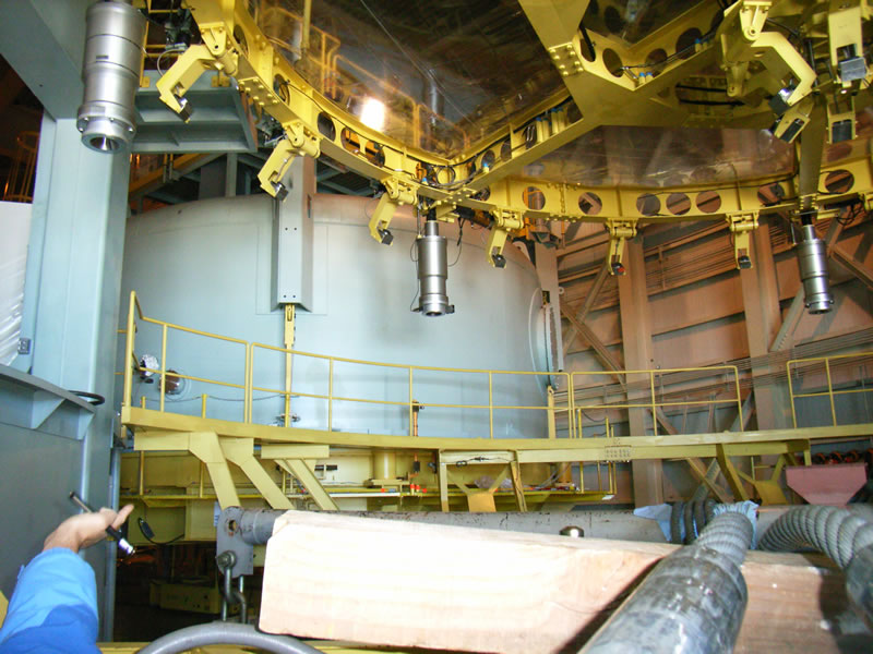 主鏡用真空蒸着アルミメッキ装置(奥)と主鏡(厚さ20cm)を支えるロボットアーム(手前) |